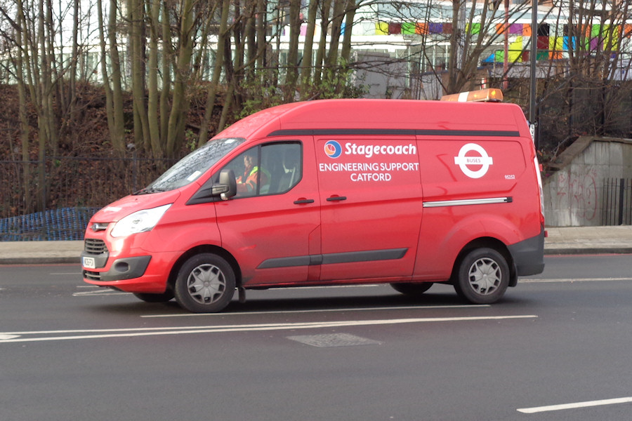 | Details: Full details of the new Stagecoach London engineering van fleet are still not available although it is believed that they were all delivered by autumn 2016. MC16FGV was in use from Catford by July, initially in unmarked red livery. It had gained lettering by 3rd January 2017, when Ray caught it passing through the revised road layout at Lewisham. One curious aspect is that it carries fleetnumber 95252 towards the rear, which would appear to be a mistake. 95252 was of course the fleetnumber carried by the previous Catford van (Mk7 Ford Transit YC11KSJ). Only one of the other Transit Custom vans has so far been reported with a fleetnumber that being 90933 on MD16SXL at Rainham. If anyone has any additional info, or details of new vans at Bow, Leyton or West Ham garages, I would be interested to hear from them. | |||