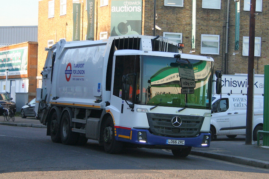 | Details: There were in fact three new dustcarts delivered around Christmas 2016, and Derek has already managed to photograph each of them. They are all based on the Mercedes-Benz Econic chassis/cab with compactor bodywork by Geesink Norba. LO66ZRC and LO66ZRD are 3-axle Econic 2630Ls, of which the former is seen here approaching Acton Works on 18th January 2017. | |||