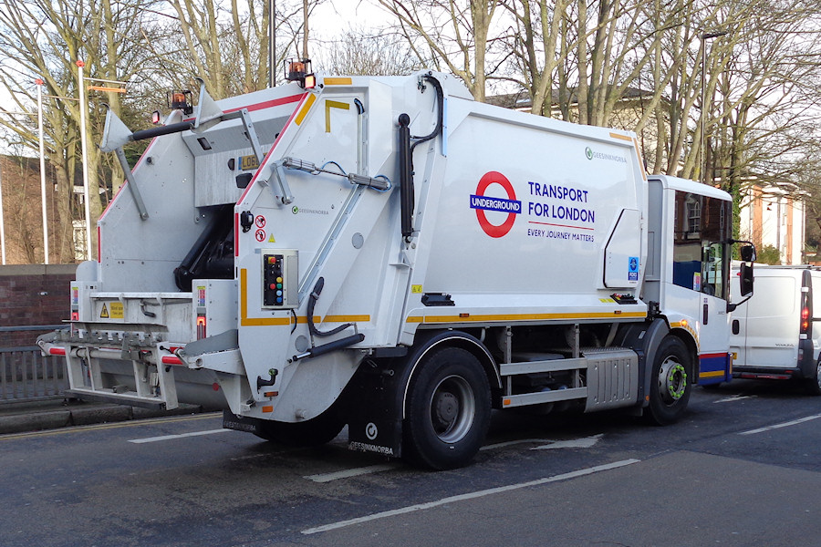 | Details: The third new dustcart (LO66ZRE) has already been shown on LTSV, but not from behind. This is the only 2-axle vehicle in the batch, and is based on a Mercedes Econic 1830 chassis. On 17th January 2017 it was seen passing Acton Town Station, still looking fairly pristine. | |||