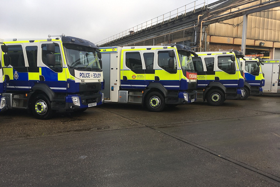 | Details: This photo taken at Acton Works on 30th January 2017 shows the two livery variants on the new Emergency Response Unit rescue tenders. In the centre are ERU liveried 2606 and 2605, with a blue skirt topped by a broad yellow band and with a red panel on the front. Flanking these are 2612 and 2608 in British Transport Police livery, on which the side band is made up of yellow and blue squares, while the front panel is white. Both variants have a reflective safety stripe half way up the blue skirt. Note also that all vehicles have full-length double-cabs. The previous vehicles (Mercedes Ategos 2592 to 2601) featured a mix of short double-cabs (with only one door per side) and long ones. | |||||||