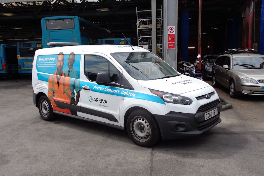 | Details: With so many bus company service vehicles having little or nothing in the way of identification, it is nice to be able to show a new van with a very 'full' livery. Ford Transit Connect Mk2 van GD66HEV was new to Arriva Southern Counties in February 2017 and is allocated fleetnumber V072. The number is not carried but the livery does include recruitment advertising. It was allocated to Northfleet garage, where it was seen during the open day on 8th July 2017. | ||||
