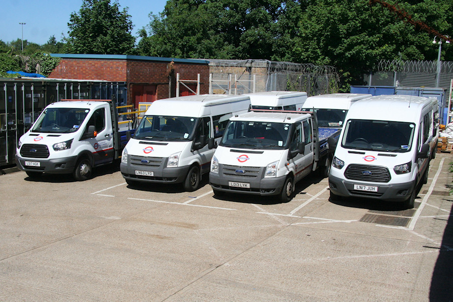 | Details: The Mark 8 Ford Transit is now becoming commonplace in the central fleet with about 85 added so far, while the number of Mark 7 Transits remaining is around double this amount. The base at Museum Way in Acton Town gained its first Mk8s in spring 2017, comprising crew van 8315F and dropside truck 8321F. Both were present on 2nd July 2017, flanking Mk7s 7709F (crew van) and 7756F (dropside). Three more Mk7s were parked on the row behind. | |||||||