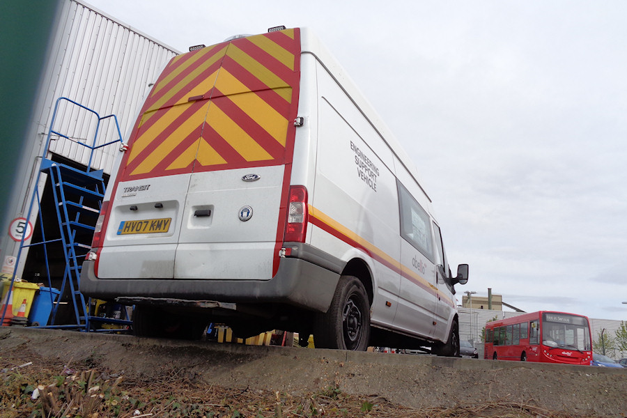 | Details: An unusual angle on an unusual livery. Seen at Abellio's Hayes garage on 15th April 2017 was Ford Transit crew van HV07KMY. One of quite a few second-hand, high-roof Transits bought by Abellio in the early 2010s, this one initially worked as a crew ferry vehicle from Twickenham (Fulwell) garage in unmarked white, gaining a fleetnumber (6739) on the nearside by 2014. It moved to Hayes in about 2016 where it was used as an engineering support van and given appropriate lettering, a red/yellow stripe on the sides and rear chevrons. Ironically it also lost its fleetnumber. The van may see other uses too since, when photographed, it had rail replacement bus posters in the side windows. | ||||