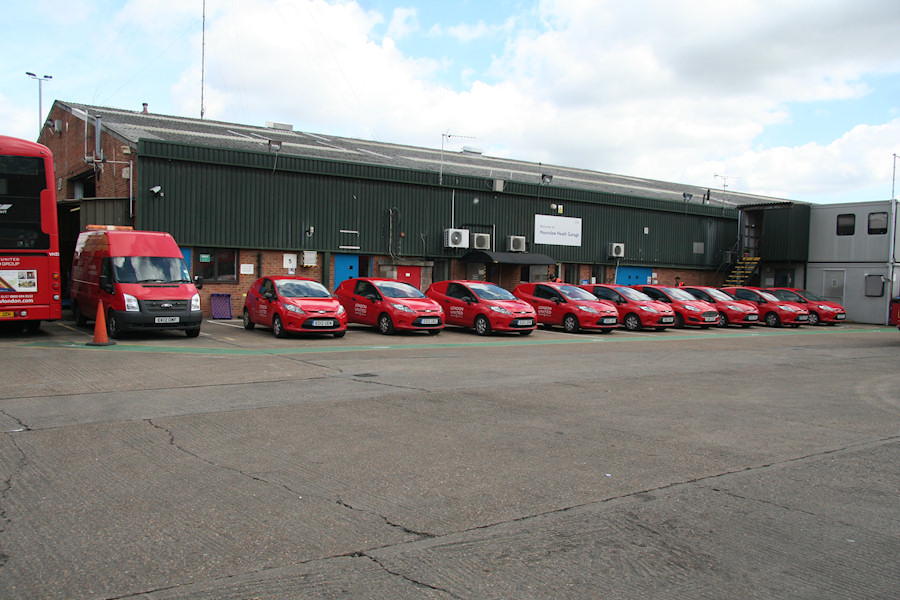 | Details: Hounslow Heath bus garage is rather remote and uses a large number of crew ferry vehicles, running most notably to Hatton Cross. I last visited in 2012 and managed to get seven ferries plus the engineering van in one photo. Derek now beats that with this view taken on 21st May 2017 featuring no fewer than nine Ford Fiesta ferries plus the Transit van. A slight problem is that I only have eight Fiestas listed as being allocated here! The nearest example is FF15 (EO12UEN), which was previously at Twickenham. Fourth from the left is FF2 (EO12UEP), transferred to the main Hounslow garage in 2013. More noticeable is the fourth from the right, with a different grille design. This is FF25 (LS15CZZ) which is/was a London Sovereign vehicle based at Edgware. I will await further reports before updating the allocations of these vehicles. | ||||||||