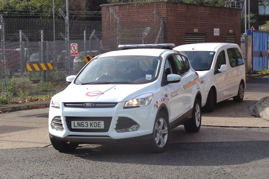 | Details: Regular visitors to this site will know that I often comment on the rarity or elusiveness of particular vehicles, but this one scores highly on both counts. Ford Kuga car 7739F was new in October 2013 and was seen passing through Neasden later that year. There was nothing more until one un-logged sighting at Broadway in late 2015 and it was then seen at Acton Works a year later. We finally managed to get a picture of it when it again came to Acton on 12th October 2017, and indeed it was left in the corner of the car park for the next few days. The car, the only one of its type in the fleet, has Incident Response markings on a white base (the black skirt is not part of the livery). It may have been allocated to the underground car park at the Palestra in Southwark but was never noted there. Following it out of the works was one of the unmarked white Peugeot Partner Tepee cars. | ||||