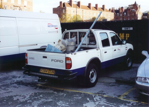 | Details: The Ford Ranger pick-up truck first joined the service vehicle fleet in 2000, since when 9 examples have been leased. One of the first trio was 4985F (V544DGN), photographed at Edgware Road depot. This view shows the tail-gate, crew-cab and protective bars fitted, enabling the carriage of loads such as this without damaging the bodywork. | ||||