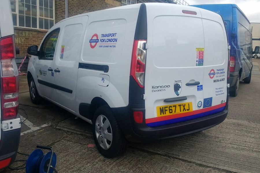 | Details: From a van leaving the fleet to one just joining. Several of these Renault Kangoo Maxis were found in Acton Works on 24th October 2017. There are two unusual aspects to them. Firstly, vehicles usually arrive with the main blue skirt already applied, and have the red (or otherwise) stripe and lettering added at Acton. This one appears to have a fairly complete set of lettering (including a fleetnumber that is not quite legible), and skirt/stripe on the rear, but not yet on the side. The second aspect is shown by the markings on the fuel filler cap and on the rear. The van is an electrically powered ZE model, a type which is now not unusual on the streets of London but which has only been used as a service vehicle once. But it has also been fitted with a Hydrogen fuel cell power pack to extend its range. These are produced by French company Symbio, whose logo features on the back, along with those of the FCH (Fuel Cells and Hydrogen Joint Undertaking) and the EU. | ||||
