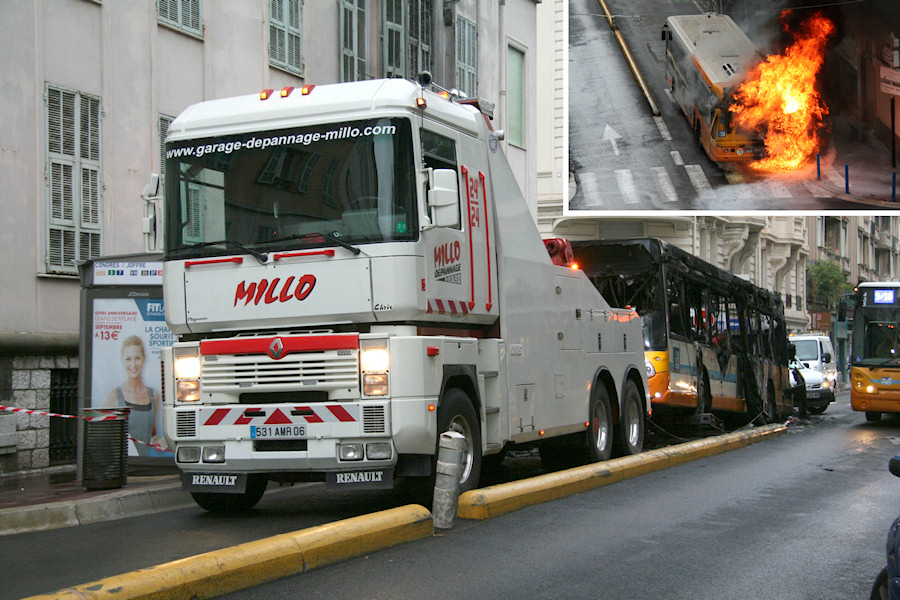 | Details: While on holiday in Nice (France) in September 2017, Derek witnessed a Heuliez bus catch fire and burn out (see inset). The remains were later taken away by Renault Magnum tow truck 531.AMR.06 of Millo Depannage (meaning repair or troubleshooting). The Renault Magnum was a distinctive design built between 1990 and 2013 and also available in Australia badged as a Mack. It was never a common sight in the UK. | ||