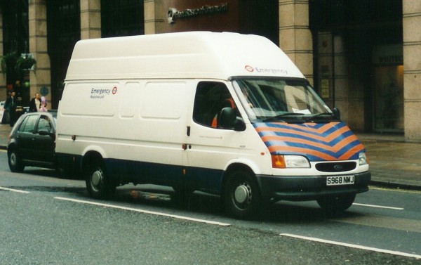 | Details: 4852F (S968NMJ) was an extended wheelbase, high-roof Ford Transit van. The standard LUL livery was modified by the addition of chevrons on the bonnet and lettering above the windscreen, the former also being carried by vehicles such as 3784F, 4711F and 5400M. Despite appearances, the roof does not detach to form a boat! Seen on Victoria Street on 18th October 2000. | |||