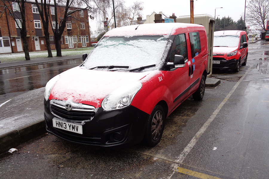 | Details: A very seasonal photo from Ray here. London had a couple of inches of snowfall during Sunday 10th December 2017, although it very kindly all disappeared before the Monday rush-hour. This photo is also topical because it shows some recent re-allocations. Go-Ahead London's Belvedere garage (which was really just a yard and an office) was closed operationally at the beginning of December 2017. Bus route 180 transferred to the new Morden Wharf base, while the 244 went to Bexleyheath. EK64CFY, the Ford Transit Connect crew van that used to serve route 244, went as well, and can be seen in the background here. It remained unlettered but now has an FB1 sign in the windows. The number FB2 was carried by Vauxhall Combo van HN13YMV, a vehicle which has had quite a complicated history. New to Northumerland Park Garage in unmarked red in 2013, it originally had no windows in the cargo doors. Windows were added by early 2014, then later that year the van was moved to the former Metrobus garage at Croydon. Here it gained Go-Ahead logos and the fleetnumber 9034, which is still carried but hidden by the snow in this view. It moved again to Bexleyheath in December 2017, although I am not sure why they need two vehicles. In contrast to the Ford, the Vauxhall had gained a depot code and a variety of labels, most of which seem to have come from buses. These include 'Mind your head when standing', 'Emergency Door Control', 'Stand clear of doors' plus what appears to be an Oyster notice and an OAP priority label! | |||||