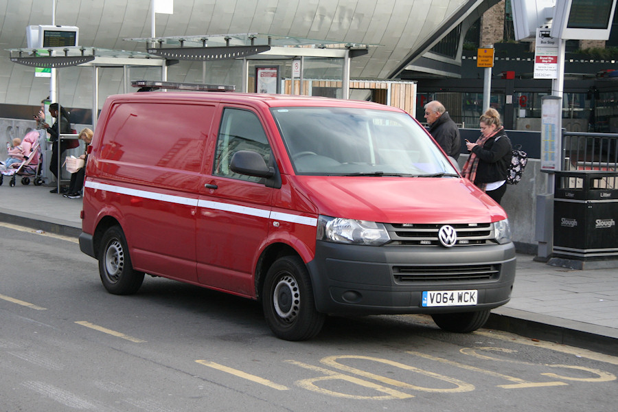 | Details: This van was found in Slough Bus Station on 10th October 2017 and seems likely to be in use with First Berkshire. As with other recent vans here, it has unmarked red livery apart from a reflective safety stripe. VO64WCK is a short-wheelbase, low-roof Volkswagen Transporter. | |||