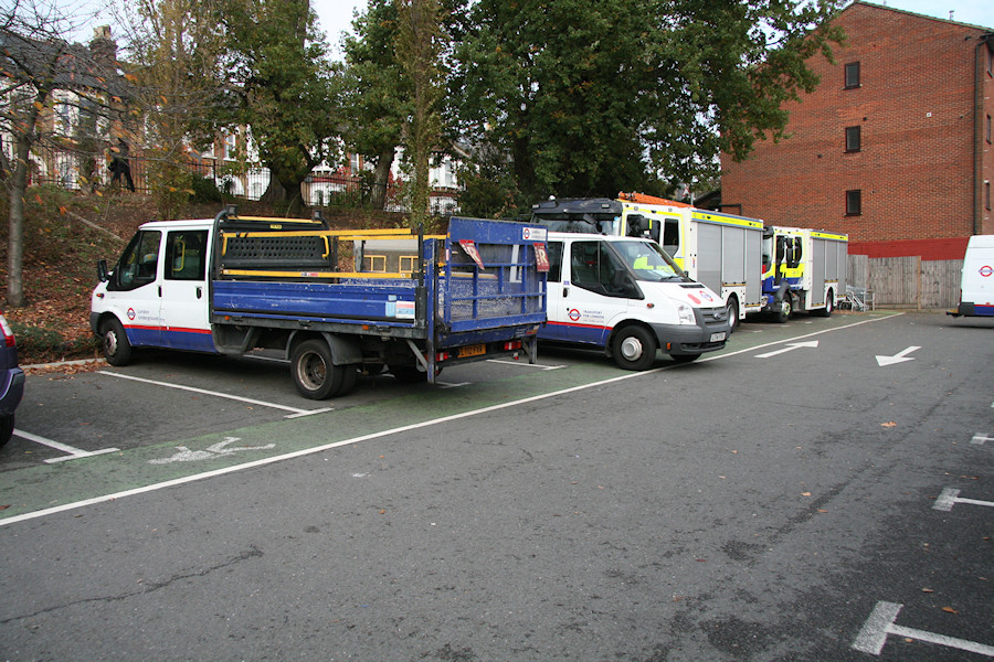 | Details: Given the relatively minor nature of the derailment at Wimbledon on 6th November 2017 I was rather surprised that at least 11 service vehicles attended. Four (and a bit) are seen here the next day, making use of the Waitrose car park. Nearest the camera are a pair of Ford Transit dropside trucks from Lillie Bridge. 7242F has LUL lettering, while newer 7821F has TfL (plus a large poppy on the bonnet). Beyond them are Emergency Response Unit tenders 2603 and 2608, both carrying TfL/ERU markings. Just visible on the right is 7673F, one of three 'facilities' vans present. | ||||
