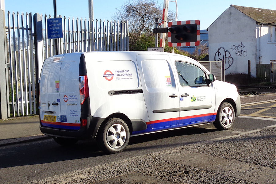 | Details: The six Electric+Hydrogen Renault Kangoo Maxi vans delivered in autumn 2017 were thought to be destined for use as mail vans, but reports have been minimal so far. On 19th January 2018 Ray noted a couple running out of Acton Works, including 8613R seen here waiting for the level crossing. The logo of Symbio (who undertook the hydrogen conversion) can be seen above the numberplate. | |||