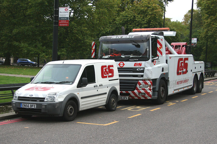 | Details: C&S Motor Group have been active in London for several years, their star vehicle being DAF CF Recovery Truck EU06HPA, first noted in 2008. It gained red/white stripes on the bumper and mirror covers by 2014, and more recently has had TfL and Buses logos applied to the cab front and sides. It can often be found parked on Achilles Way, near Hyde Park Corner, as here on 14th October 2017. Joining it on this occasion was Ford Transit Connect van EN56BFE. | ||||