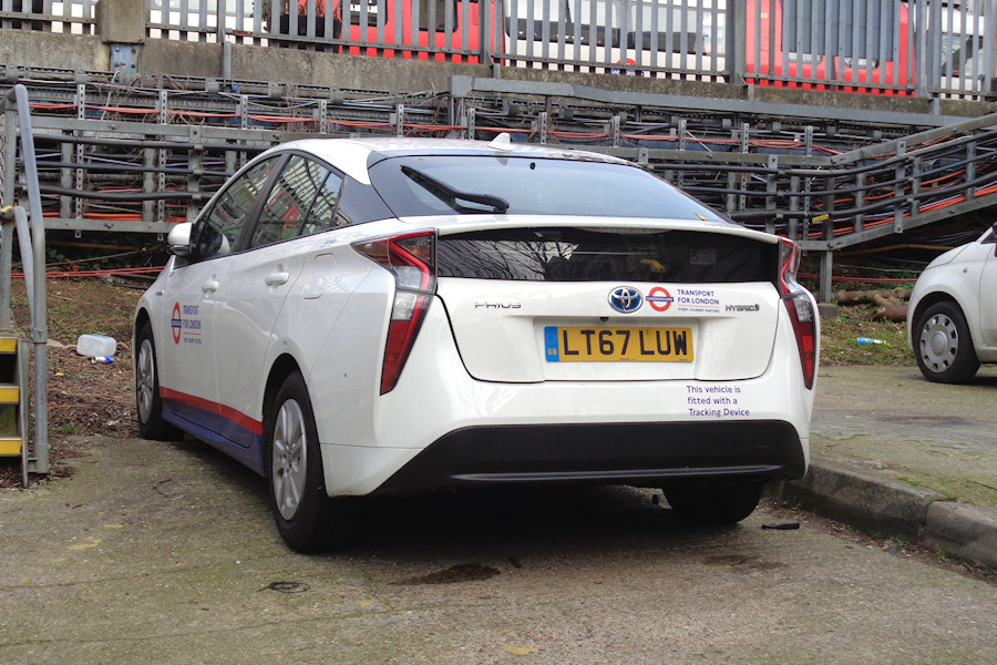 | Details: The first Toyota Prius car for LUL was new exactly a year ago and there are now thirty in the fleet. Allocations for most of them are unknown but 8550T has settled at Golders Green Station, making it one of the easiest to see. I have been sent three photographs of it in its new home, including one of it unusually facing outwards. However, as the front of 8550T has already been shown on LTSV, I have used Ray's shot of its behind, taken on 8th February 2018. I need to amend the database entries for these vehicles. The fact that they have a clearly marked Petrol filler cap shows that they are hybrids rather than pure electric. | ||||