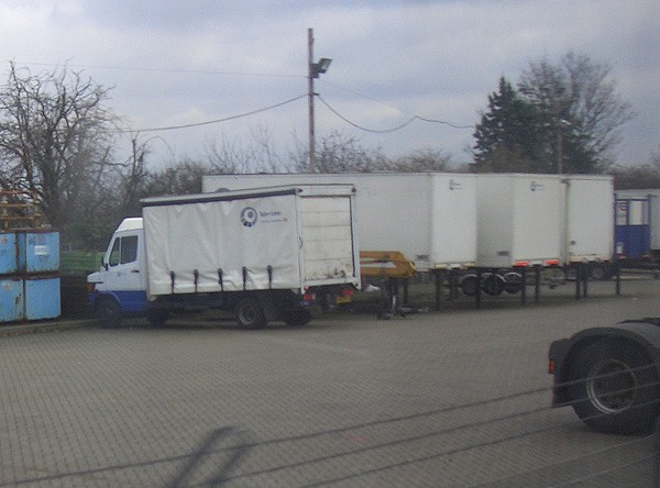 | Details: The lorry yard at Acton works is right next to the District and Piccadilly line tracks, but getting decent pictures from bouncing trains with grimy windows is not easy. I decided to include this February 2004 attempt anyway as it shows a couple of items of interest. The Mercedes-Benz curtainsider to the left is 2511M (K462RLA), and this view shows that a roller rear door is fitted. To the right of that is what appears to be a towable access lift, followed by four un-mounted demountables. As can be seen, these bodies have folding legs to enable the chassis units to be driven under them. Three of the bodies are vans while the furthest is a dropside. | ||||