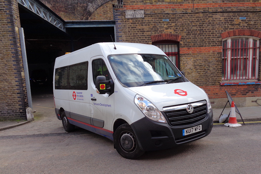 | Details: Most of the London Buses Passenger Data minibuses (used by staff conducting bus use surveys) are kept at Chancel Street when not at work. The latest additions are three Vauxhall Movano minibuses in the LUL-alike white/blue/red livery. Ray found 8304V reversing in on 16th April 2018. | ||||