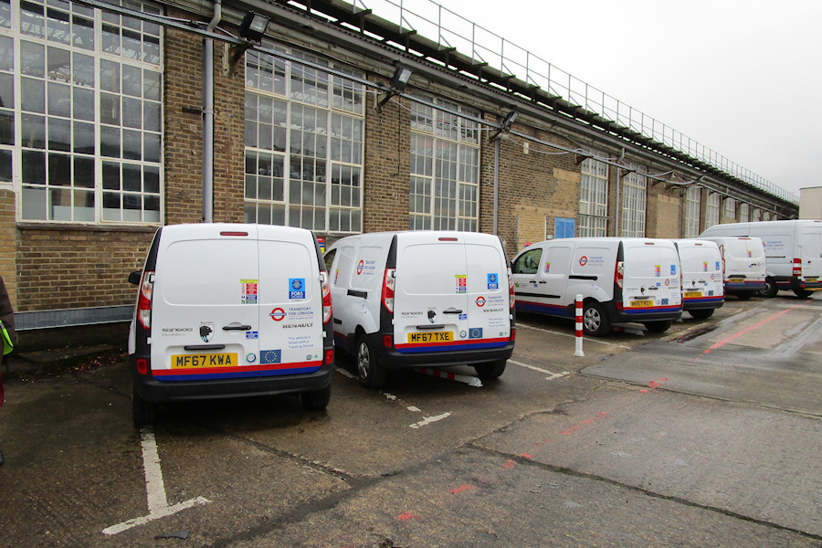 | Details: Four of the six Renault Kangoo ZE electric+hydrogen vans were seen at Acton Works on 10th April 2018 (with a fifth parked nearby). It is believed that these vans are to be used as internal mail carriers, although observations of them on the road have been infrequent so far. The vans seen here are (left to right) 8612R, 8614R, 8613R and 8616R. Beyond them are 8506F and 8257M, as already illustrated. | |||||||