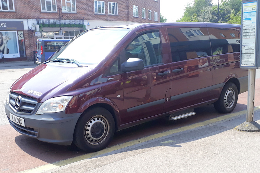 Details: RJ11ZWX was one of two Mercedes-Benz Vito minibuses acquired by Epsom Coaches in 2011 for use as passenger transfer vehicles in connection with coach tours and holidays. They also saw some use as crew ferry vehicles for the associated Epsom Buses operation. The coach side of the business was wound up following the sale of the company to RATP, while the bus operations have been gradually merged with those of neighbouring London United. RJ11ZWX now displays RATP group fleetnumber MV70021 (having earlier been MV02) but is otherwise in unmarked brown, having lost its holiday advertising. It should also be mentioned that this minibus carried select registration A9HRR for a while in 2016/2017 but has now reverted to its original mark. Seen at Banstead on 22nd May 2018.