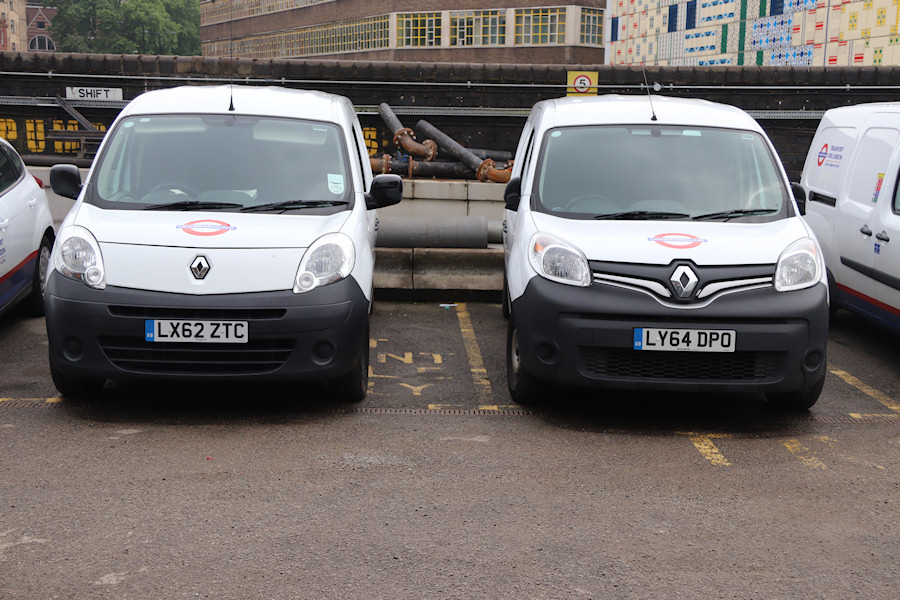 | Details: Not many 'Phase I' Renault Kangoos are left in the central fleet, these being recognisable by having a body-coloured panel between the headlights compared to the 'grille' of the 'Phase II' design. Maxi 7482R, on the left in this photograph taken at Edgware Road Station on 31st May 2018, was sent off to BCA a couple of weeks later. 7976R on the right is also a Maxi van and spent some time here when new. Judging by reported sightings, it then moved to Templar House at Holborn but may now be back. | |||||