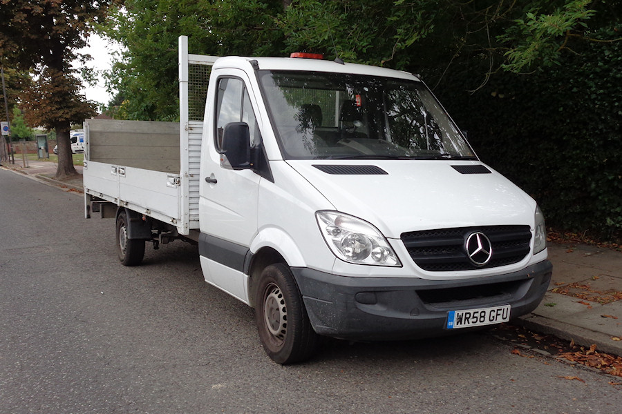 | Details: Former service vehicles can often be recognised by their retaining parts of the original livery (for example the blue skirt on LUL vehicles). Ray did well to spot this one in Avery Hill Road (Eltham) on 12th August 2018 since it was now in plain white. Mercedes Sprinter dropside truck WR58GFU was fleetnumber 6695M between 2008 and 2015, being based at Frank Pick House. It still has the light-bar and tail-lift but has lost the under-body storage lockers. 6695M was the first Mercedes-Benz dropside in the leased fleet. | |||