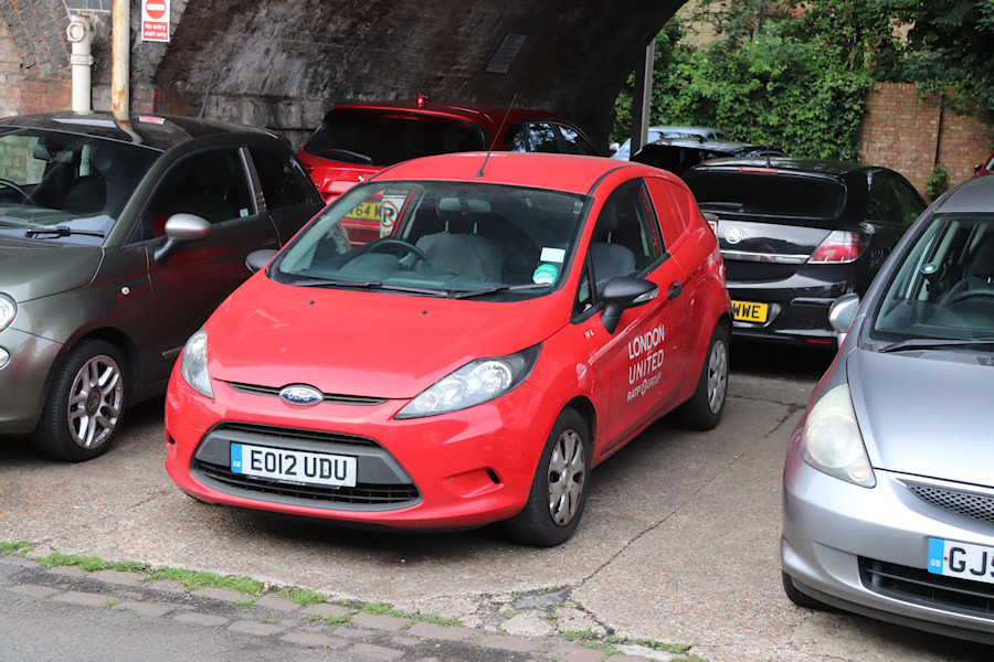 | Details: The application of new fleetnumbers to the RATP (London United / London Sovereign / Epsom Buses) fleet has been somewhat limited, most still carrying the original, shorter numbers. Showing this feature, and its recent transfer from Hounslow Heath to Shepherds Bush, is Ford Fiesta van FF4. Officially FF75004 since 2016, it was seen at its new garage on 31st May 2018. | ||||