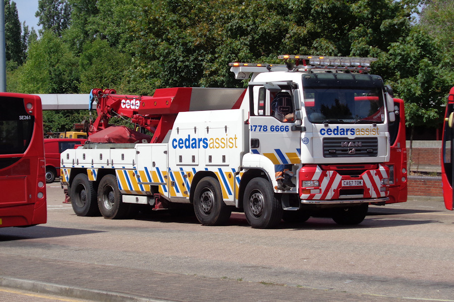 | Details: Some pretty impressive recovery trucks have featured on LTSV over the years, the biggest being those with four axles. Joining that elite is CA57TOW, Cedars Assist number 49, a MAN TG-A 35.400 8x4 with a 10-litre engine producing 394bhp and driven by 'Borris'. On 19th July 2018 it had been called to Eltham Bus Station to collect Go-Ahead London Enviro 200 bus number 176. Cedars are one of those 'modern' companies that don't see the need for capital letters. | |||