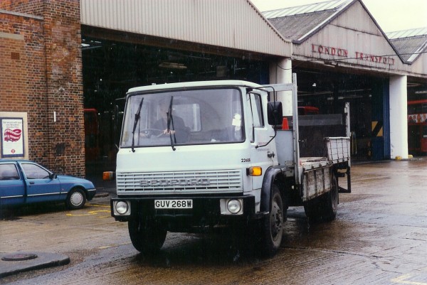 | Details: Most of the 17 Bedford TL lorries bought by London Transport featured black radiator grilles, thus highlighting the manufacturer's name. Exception included 2268B (GUV268W), a TL1260 dropside lorry with tail-lift new in October 1980. It was photographed at Walthamstow bus garage (which also maintained service vehicles) on 28th March 1988, three months before it left the fleet. | ||||
