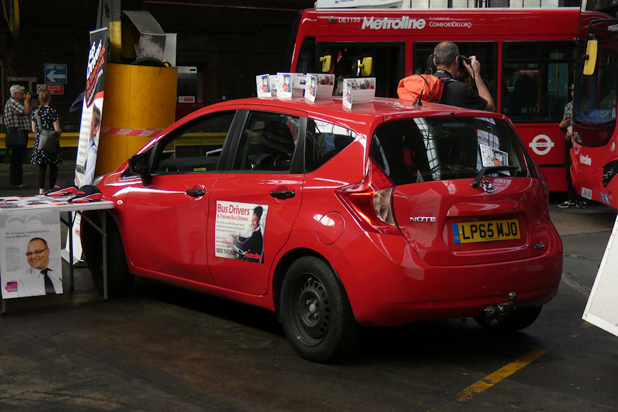 | Details: Photographed during the Holloway Garage open day of 15th September 2018, this car was part of a display advertising bus driver recruitment. Metroline has used a few Nissan Note cars over the past ten years, and similarly registered LP65TUW is a crew ferry vehicle based at Brentford. LP65MJO has not been reported before but is probably based at the company's head office in Cricklewood. Just visible on the right is a small trailer with large recruitment posters, this having been towed here by the car (note the tow-bar). I didn't examine the trailer closely but I assume it did not have a fleetnumber! | ||||