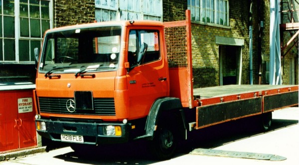 | Details: Five Mercedes-Benz 814 dropside trucks arrived in a red livery in 1990 for use by bus garages, although some were later used by LUL. This example (2487M H218FLB) was based at Walthamstow bus garage during 1991 then transferred to Acton. The shade of red appears to somewhat lighter than LT standard, and the cab-side lettering is black rather than the usual white. This picture also demonstrates that drop-sides really do drop! This truck was soon repainted to LUL white/blue and was still in stock at mid-2003. | |||