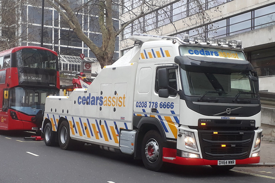 | Details: Two contributors photographed this recovery on 20th March 2019, so I have decided to include one photo from each. Merton's Wright Streetdeck bus WSD10 came to grief opposite Victoria Coach Station while working route 44. Cedar's Assist (I couldn't stop myself from adding capitals and an apostrophe!) attended with their Volvo FM DV64WWR. | ||