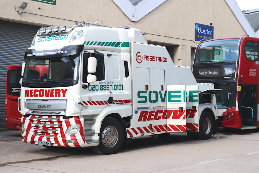 | Details: Hants and Dorset Trim of Eastleigh undertakes many refurbishments and repaints of London buses. On 2nd April 2019 Derek was visiting their base (adjacent to the Bluestar garage) and photographed Sovereign Recovery DAF CF GN65NHJ having recently arrived with London United ADH45022 on tow. The only noticeable change to this 2-axle tow truck since it was new in 2016 is the addition of fleetnumber H128. Parked behind the truck is Go-Ahead London Wright Streetlite bus WS31. | |||