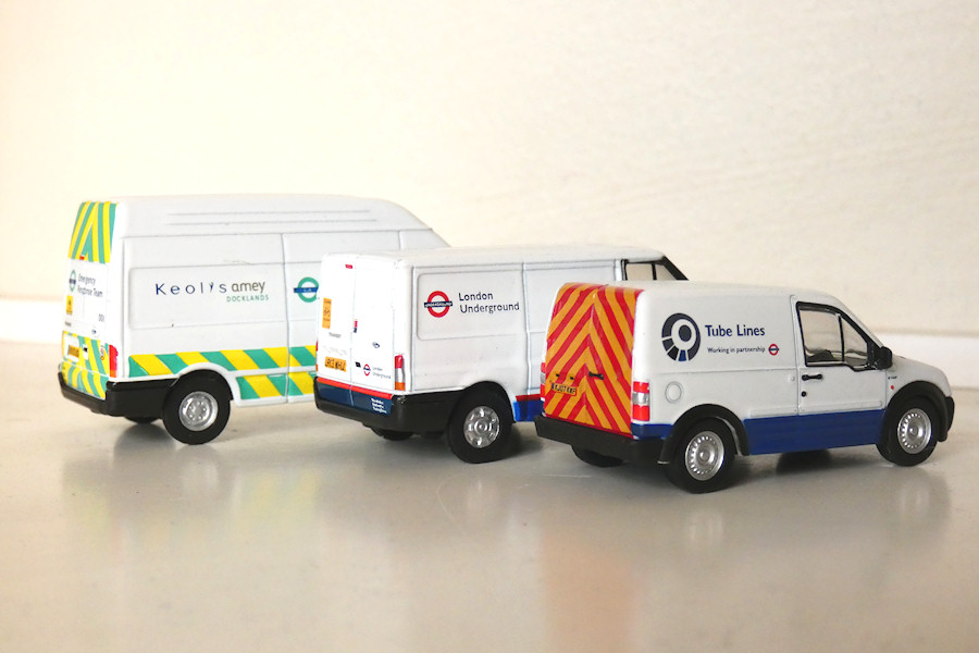 | Details: A rear view of the three Oxford Diecast Ford vans in LTSV-related liveries. A couple of points about the Transit Connect (on the right here) are questionable. The Tube Lines logo looks to be too large, that on the nearside being more correct. The rubbing strip has been painted white, whereas 6144F was one of few Connects to not actually have a strip. This is fair enough, given that the strip is part of the casting. Finally, I don't believe 6144F had rear chevrons, although I do not have photographic evidence. These minor quibbles aside, the models are really rather good, and more are on the way including unique Land Rover Freelander 7429LR, and a Transit dropside and Transit Connect both in LUL livery. Older Ford marques (such as the Cargo lorry and Transit Mk.3/4) are also available from Oxford, so these could form the basis of future SV models. | |||||
