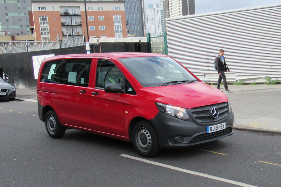| Details: Having just dropped off a driver, Go-Ahead London Mercedes-Benz Vito minibus RJ19HSY was seen leaving the side road adjacent to Stratford Bus Station on 25th April 2019. It seems most likely that this example is based at Silvertown garage. | ||||