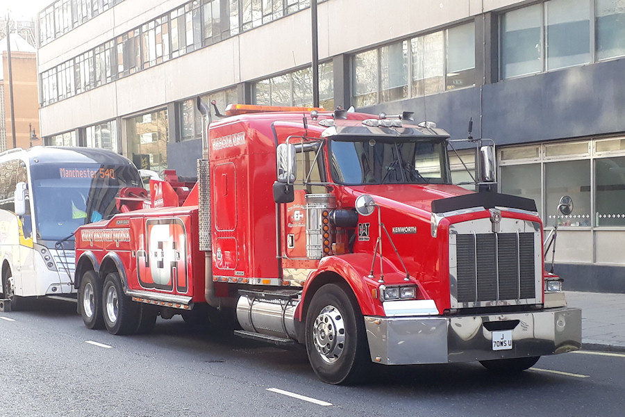 | Details: Time to resume the 'breakdowns in Victoria' series from last month! Photographed outside the coach station on 31st March 2019 was this rather impressive Kenworth truck belonging to J&A. Kenworth is an American make that is very rarely seen in the UK. This example is the third to be shown on LTSV, all of which were recovery vehicles. Note that this one has an extended cab, normally this being used to create a sleeping space for long-distance truck drivers. The registration is J70WSU but arranged to look like J Tows U. | ||