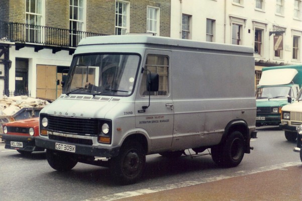 | Details: This rather dumpy looking van is 2309D (CGT309X), one of five Dodge 50 S66 vans bought in the early 1980s. All wore grey livery throughout and all were withdrawn by late 1990. Photographed at Baker Street on 19th March 1986. | |||