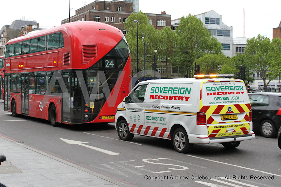 | Details: Judging by photos received over the past few months, Sovereign Recovery is no longer dominant in bus recovery work, although its vans are still a common sight. Andrew came across Volkswagen Transporter GC18LJU (fleetnumber SV307) attending to Metroline LT13 on 6th May 2019, the bus having unfortunately conked out in the middle lane of Hampstead Road opposite Warren Street station. | |||