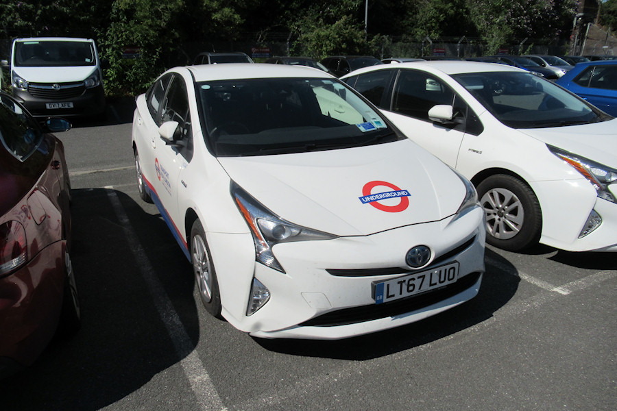 | Details: 32 Toyota Prius hybrid cars were leased for LUL in 2017/2018, a couple of which have proved to be elusive. For example, 8584T was noted in Acton Works car park when new in September 2017 and then disappeared to an unknown location. It made a return visit to the works on 4th July 2019 and luckily Ray was also there. The plain white Prius alongside is either part of the unmarked fleet, or one of the cars belonging to facilities contractor Interserve. | ||||