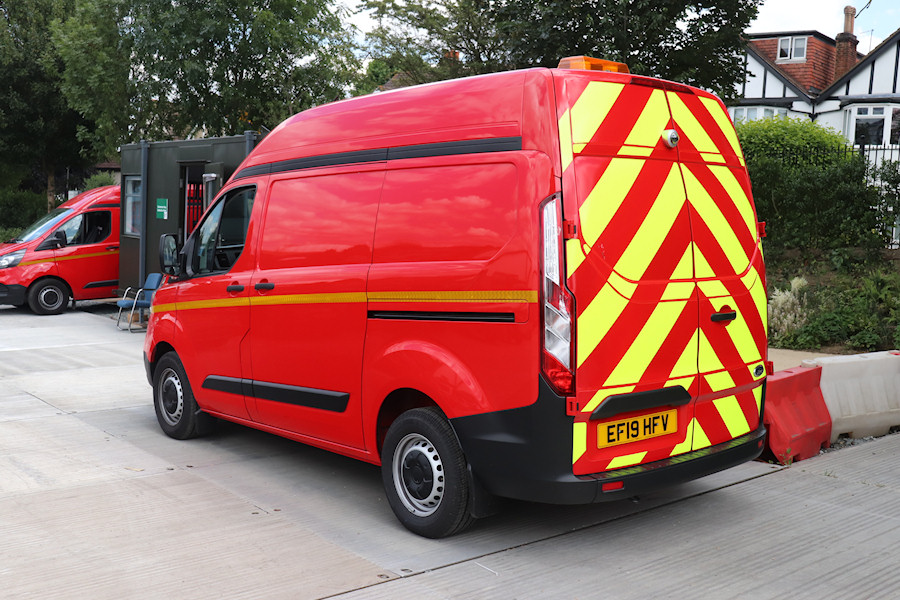 | Details: Every year during the Wimbledon tennis, a temporary parking space is created nearby for the buses used on services to local stations and central London. Seen there on 2nd July 2019 were a pair of new vans in unmarked red livery. Both are high-roof Ford Transit Custom vans operated by Go-Ahead London. Although broadly similar, EF19HFV is a short-wheelbase 280 model while EF19HHG beyond is a medium-wheelbase 300. Also, HFV has a short, old-style light-bar, while HHG has a wider, LED one. Derek was told that HFV will be based at Camberwell once the tennis is finished, while HHG will be a city 'runaround', with no fixed allocation. At least one further Transit Custom has since been delivered to Sutton Garage (EF19HFS). | |||