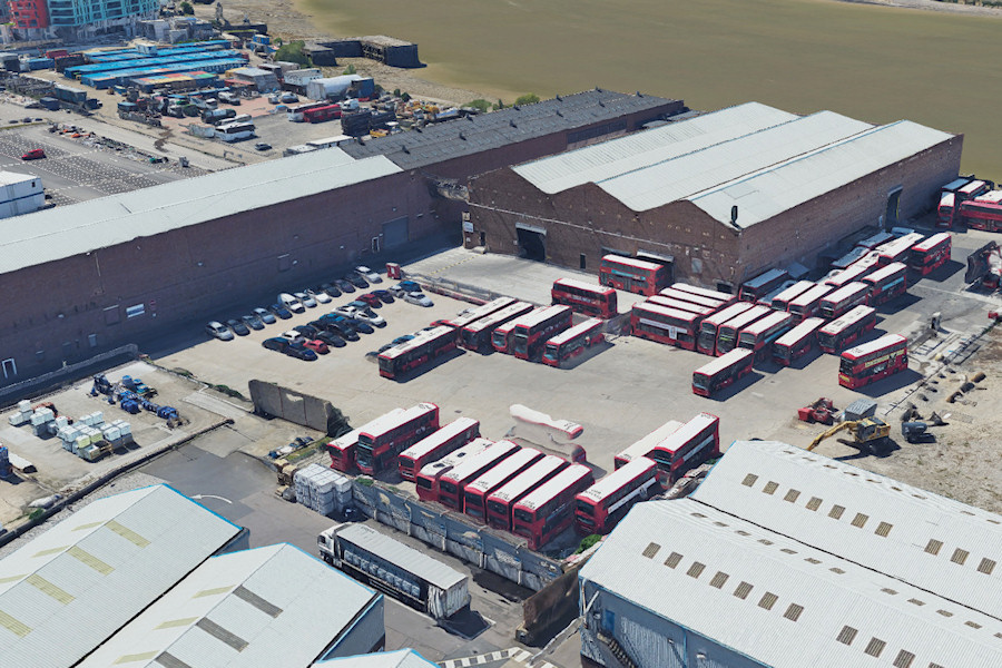 | Details: And now for something new. I have made much use of aerial photographs over the years, most often to investigate service vehicle locations. Birds-eye views are the most useful, where the camera is not looking straight down. Bing maps used to have this feature, where you could you view any location from the direction of each compass point. However, this seems to be no longer available. Happily there is an alternative, and it is, in some ways, even better. Google maps has aerial photographs of pretty much the whole world. Many areas are now also covered in 3D, meaning you can select the angle and elevation of your view. The level of detail is remarkable, with objects smaller than cars being modelled in 3D. I don't know how it is done but I assume there is some compositing of images taken from different directions, this then being applied to a detailed topographical model. There are some glitches, particularly with vehicles, no doubt caused by them moving between the time of the various images being taken. For four reasons, I recently decided that it would be worth adding a selection of images from Google to the LTSV website. Firstly, the loss of the Bing facility, and the fact that the Google images are periodically updated, means it is worth 'preserving' these images. Secondly, it allows me to show locations that are inaccessible. Thirdly, it will enable the locations of existing photographs to be put into context. Fourthly, I will be able to highlight some interesting discoveries. Let's hope nobody from Google minds! Anyway, enough of the waffle, let's talk about this photo. This is Go-Ahead London's Morden Wharf garage, located on the Greenwich peninsula and opened in July 2017, primarily to replace the small Belvedere garage. This view is looking almost south-west, with the River Thames in the background. Although Morden Wharf does have an engineer's van and a couple of crew ferries, none are visible here. However, the red bus in the background caught my eye. Parked with some modern white coaches and a couple of black Routemasters, this was unmistakably a former LT Swift bus. In moving to take a closer look I then noticed the red van which can be seen in the top left here. This turned out to be one of the LBSL Infrastructure VW Caddy Maxi vans, parked in a large car park with a couple of Highways liveried cars. The LBSL VW vans were mostly withdrawn in early 2019 so this image must have been taken before then. As far as I know, their duties are now covered by Highways contractors, so this location probably won't be added to the LTSV database. | |||