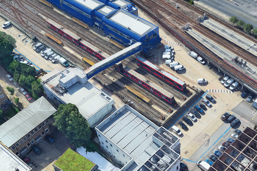 | Details: I recently published a couple of photos of Poplar DLR depot taken from the platforms of the adjoining station. This image from Google Maps shows the same area but reveals the fact that more SVs are parked directly below the platforms, while yet more can be seen parked on the left. Note also the 'ghosted' train at the nearest platform. Such glitches aside, the conversion from 2D photos to 3D models is amazingly good. Note that you can see underneath the footbridge. The building in the bottom left corner seems to have an open roof, and you can see some detail inside. I believe this is an electrical substation. | |||