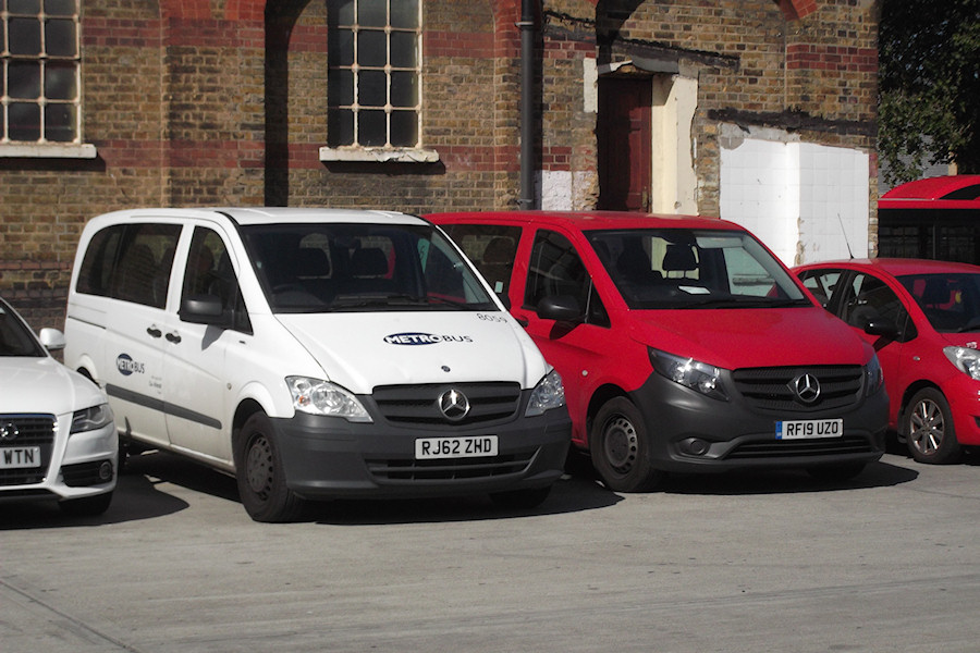 | Details: Go-Ahead London currently has over 50 Mercedes-Benz Vito minibuses and crew vans for use as crew ferry vehicles, about half of which have been new in the past year. The oldest remaining examples date from 2013 and had been new to Metrobus in white livery. Although many of these have subsequently been transferred elsewhere within the operation, several have continued to carry their Metrobus names and fleetnumbers. This can be seen on 8059 (RJ62ZHD), parked at Northumberland Park Garage on 18th September 2019. 8059 had spent about three years working from Orpington, then a further three years at Silvertown. Parked alongside was RF19UZO, one of the numerous new examples, all of which are in unmarked red. | |||||