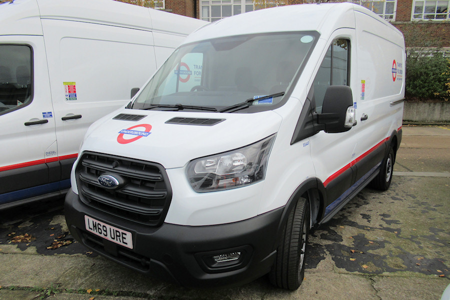 | Details: At the end of November 2019 deliveries of Ford Transit Mk8 vans resumed after a break of several months. The new vans were the first to the '2020 Facelift' design, with a slightly revised shape to the front grille. The change to the shape is quite hard to describe in simple terms, and it would be easier to just compare this view with earlier photos such as this one of 8648F. The new shape seem to be a 'motif' that is also seen on the latest version of several other Ford models. Perhaps an easier means of recognising the new Transit is the fact that there is now no body colour between the grille and the bumper. 8844F is a medium-wheelbase, mid-height van, first licensed on 2nd December 2019 and seen 5 days later at Acton Works in full LUL livery. | ||||