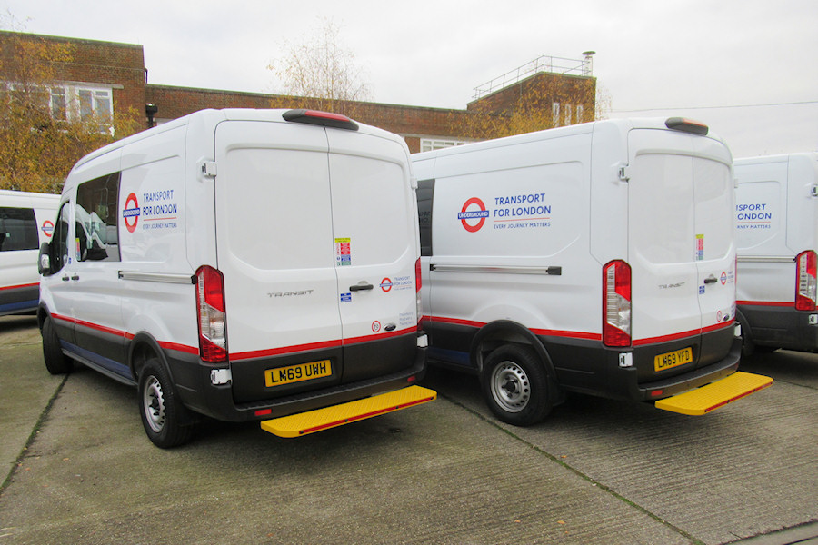 | Details: From the rear, the only change with the '2020 Facelift' of the Mk8 Ford Transit van appears to be the stop light at the top. Previously flush with the bodywork (as seen on 8843F), it is now fitted in a prominent black housing. This view also usefully shows the differences between the medium-wheelbase (on the left) and long-wheelbase (right) variants, most noticeably that the door runner extends to the rear on the former. 8916F (on the left) and 9053F (on the right) are both mid-height crew vans and were photographed in the DSM yard at Acton Works on 7th December 2019. | |||||