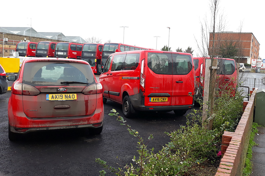 | Details: The new crew ferry parking area at Potters Bar Garage has been resurfaced with tarmac since we first showed it last autumn. This new photo, taken on 26th January 2020, also shows how close the compound is to the High Street, the pavement of which is just visible in the bottom left corner. Metroline crew ferries are usually unmarked and the allocation here is no exception. Most duties are covered by two pairs of Ford vehicles, comprising two Grand C-Max cars (like AX19NAO on the left) and two Tourneo Custom minibuses. Of the latter, AV16CNY was absent for a couple of months at the end of 2019, presumably for repairs. In its place a black Peugeot minibus (GK19XNF) was hired. Judging by its relatively clean state, AV16CNY may have only recently returned when this photo was taken. | |||||