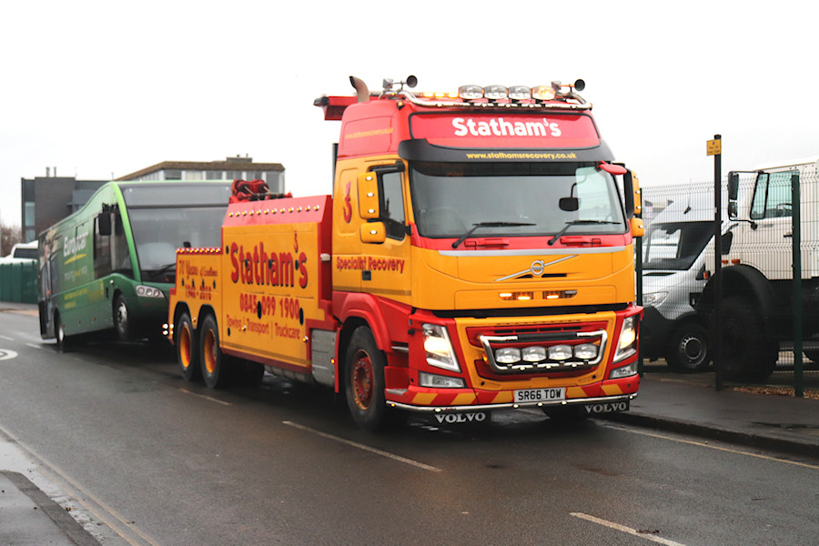 | Details: Statham's Recovery SR66TOW has the same size engine as SR61TOW but appears to have a lower profile cab, possibly in the FM series rather than the FH range. The livery is also slightly different, including the fleetnames not being in all capitals (and the hook apostrophe re-appearing). It was photographed near the various commercial motor dealerships in Bedfont on a murky 10th December 2019, with Europcar Heathrow's Optare Solo bus YJ68FVK on tow. Not much else I can say about this, but take a look at the truck in the yard on the right. This looks like a Unimog but is massively tall, with huge wheels and a lot of clearance. | ||