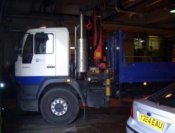 | Details: Sole MAN (!) service vehicle 2579 is notoriously difficult to photograph in its covered parking slot at Griffith House. This view taken on April 25th 2004 shows the large crane and American-style exhaust pipe fitted, together with part of the low-sided body. | ||||