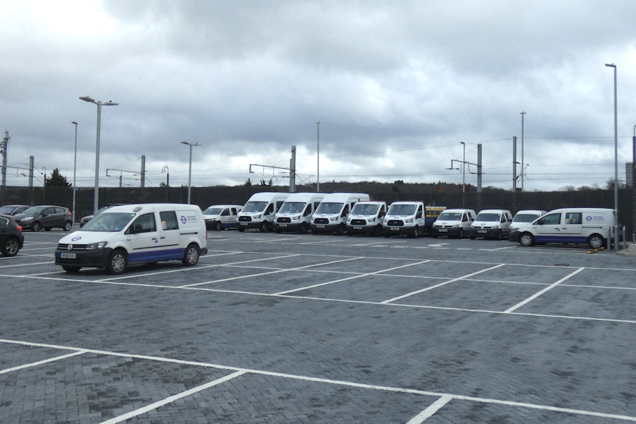 | Details: Passing Plumstead depot on a train recently, I noticed that the Elizabeth Line service vehicles had been moved again. They started out in a temporary yard north of White Hart Avenue, then moved to a small yard within the new depot. This was on the south side of (and adjoining) White Hart Avenue, but it had a fine mesh fence which precluded photography. The third location is at the south side of the main depot car park, which is easily viewed from White Hart Avenue. Fourteen vehicles were present on 23rd February 2020, most of which can be seen in this view. Nearest the camera on the left is Volkswagen Caddy Maxi crew van 8639VW, which had a portable light-bar mounted above the passenger door. The other vehicles visible are (left to right) Caddy 8634VW, Transit crew vans 8648F, 8646F and 8647F, Transit dropsides 8667F (in LUL livery) and 8654F then Caddy crew vans 8638VW, 8636VW, 8637VW and 8641VW. | ||||