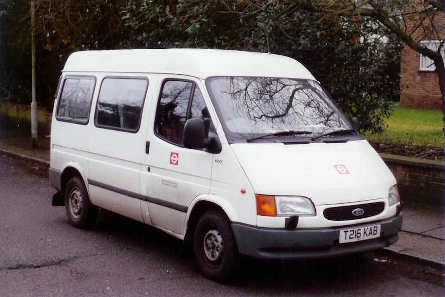 | Details: Short-wheelbase, mid-height Ford Transit minibuses were less unusual than vans of that size. Indeed almost all Transit minibuses operated during the Mk3/4/5 era were mid-height, regardless of length. 4900F was a short-wheelbase Mk5 used by London Buses for passenger surveys. It carried an all white livery, although similar 5017F, delivered a few months later for the same department, was in red/orange. The headlight washers, more prominent on the Mk5 Transit, were specified on most minibuses but very rarely on vans, perhaps due to regulatory requirements. | |||