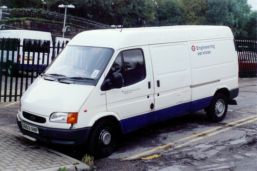 | Details: 4901F was a fairly standard, long-wheelbase, mid-height Ford Transit van, with 'Engineering services' logos and 'Northern line' branding. New in February 1999, it was seen at Finchley Central Station some time later, as evidenced by the presence of Mk6 Transit minibus 5241F (new in July 2001) in the background. | ||||